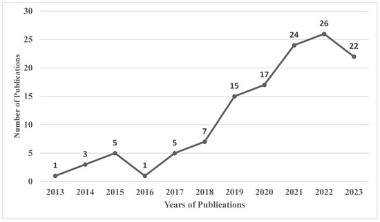 Figure 3 illustrates the annual distribution of publications from 2013 to 2023. Interest in DTs for C&DW witnessed gradual growth before 2019, with at most 20 relevant papers published annually. A notable increase occurred in 2020, with two more publications than the previous year, 2019. In 2021, there were 24 publications, which denotes a further increase of 7 publications from 2020, followed by a significant rise in 2022 to 26 articles. Previous studies have opined that DTs for C&DWM in the construction industry are gaining more attention [16,19,31], which has become a critical domain in the construction sector. Therefore, the outcome denotes a notable interest in DTs for C&DWM over the past four years, which aligns with earlier research that identified DTs as a prominent topic within the construction sector.