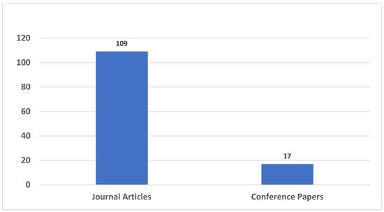 As shown in Figure 4, 126 documents were published, including 109 journal articles and 17 conference papers. The increased number of journal articles could be due to the fact that they undergo a more rigorous peer-review process than conference papers. This process can enhance the credibility and impact of research, making journal publications more desirable for academics. Likewise, journal papers contain more comprehensive and detailed studies, with more in-depth analysis, discussion, and presentation of results.