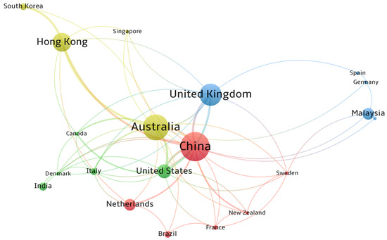 The publication distribution by countries was analyzed based on citations to assess how their collaboration influenced the development of the field. Figure 5 illustrates contributions from 20 countries on DTs for C&DWM in the built environment. The larger circles in Figure 5 denote higher publication outputs from respective countries, and thicker lines indicate stronger collaborative ties. Therefore, countries with substantial document outputs and robust collaborations are visually highlighted with larger circles and thicker lines. The extent of geographical coverage suggests that C&DWM issues in the construction sector are a global concern. The study used specific search criteria: co-authorship as the analysis type and country as the analysis unit, with a minimum threshold of three documents and three citations per country. Out of 48 countries considered based on the search criteria, only 20 met these criteria. Table 2 details these 20 productive countries, their number of articles, citations, and total link strength. In Figure 5, node sizes illustrate each country’s contribution to C&DWM research.