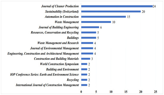 The results show that the 126 articles chosen appeared in 59 different publication outlets, as illustrated in Figure 6. A notable number of these articles (47%) were featured in just three specific academic journals: Journal of Cleaner Production (19%), Sustainability (Switzerland) (16%), and Automation in Construction (12%). This indicates that research in this area is closely tied to sustainability efforts. As a result, implementing DTs for C&DWM is an emerging and expanding field that is heavily connected to sustainability studies. Understanding these impact metrics can help researchers’ select appropriate publication outlets for submitting research articles.