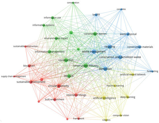 Similarly, “construction and demolition waste” was used to substitute variables like “waste”, “CDW”, and “construction waste” etc. After the data cleaning, 37 keywords met the threshold for the analysis of co-occurrence keywords. The top 22 keywords, with their frequencies and total link strengths, are shown in Table 3.