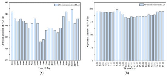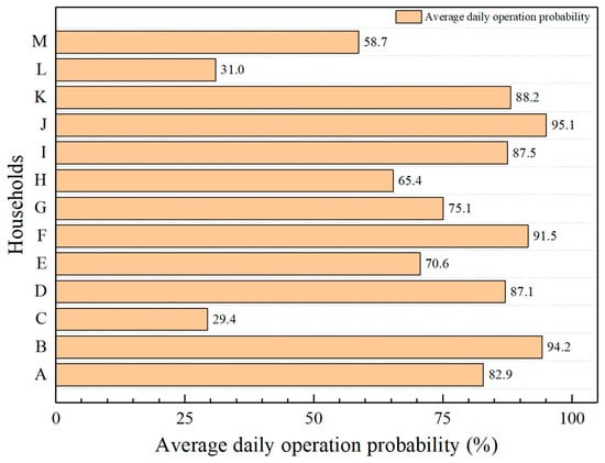 - Significant differences were found in the FAS usage behaviors of different households. Among them, six households (B, D, F, I, J, and K) have an average daily operation duration of more than 20 h; households C and L have an average daily operation duration of less than 7.5 h; the other households (A, E, G, H, and M) have average daily operation durations in the range of 14.1–19.9 h.
