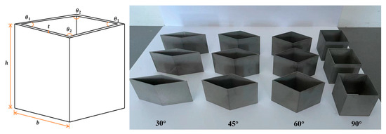 Axial compression tests were carried out on a set of rhombic short tubes to investigate the effect of the angle between the side plates on the compressive properties of the rhombic short tubes. The specimens used for the test were built by additive manufacturing technology and the process was layered manufacturing. The specimen is shown in Figure 1. The acute angles, were 30°, 45°, 60°, and 90°. Except for the angular parameters, and , the rest of the parameters remained unchanged: the height, the thickness, and the width of the plate on one side of the short tube were 30 mm, 0.6 mm, and 30 mm, respectively.