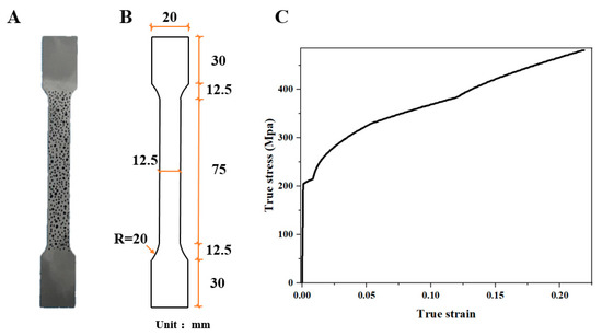 (A) Flat specimen for tension test. (B) Dimensions of the flat specimen. (C) True stress–strain curve.