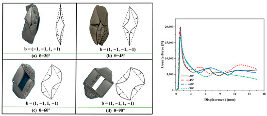 A total of four types of rhombic short tubes was tested in the compression test. Figure 4 plots the deformation of the specimen under the final moment of compression, the schematic diagram of the buckling mode, and the displacement–counterforce curve for the corresponding specimen. According to Figure 4, under axial compression, all the short rhombic tubes in the test buckled and were damaged, and 1st-order local buckling occurred in each side panel, showing different deformation modes. The difference between the buckling strength for each condition is small and much higher than the displacement values at other moments [29].