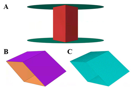 (A) Finite element model. (B) Direction definition for the model. (C) Mesh subdivision for the model.