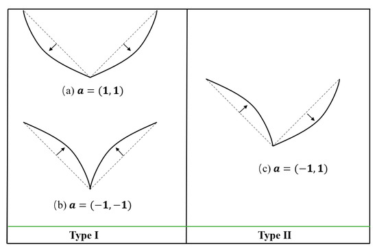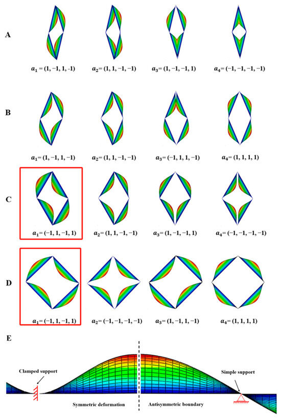 - More intuitive naming rules. Due to the peculiarity of the deformation modes of the structure, the buckling mode vector of the structure can be used as the name of the structure. Compared to the previous classification of the deformation modes of the basic folding elements into asymmetric (Type I) and symmetric (Type II), the present method allows for the further classification of arbitrary deformation modes, as shown in Figure 11. Such naming provides a visual representation of the deformation mode of the structure, and the more sides there are, the more efficiently the information is conveyed. At the same time, the method is richly extensible and equally applicable to higher-order buckling.