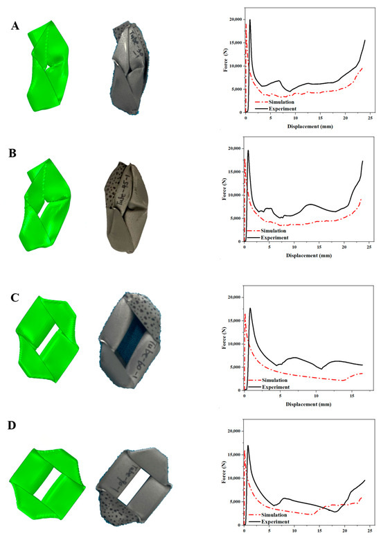 Deformation modes of the finite model (left), experimental model (middle), and displacement–force curve (right) under compression after the introduction of specific defects: (A) . (B) . (C) . (D) .