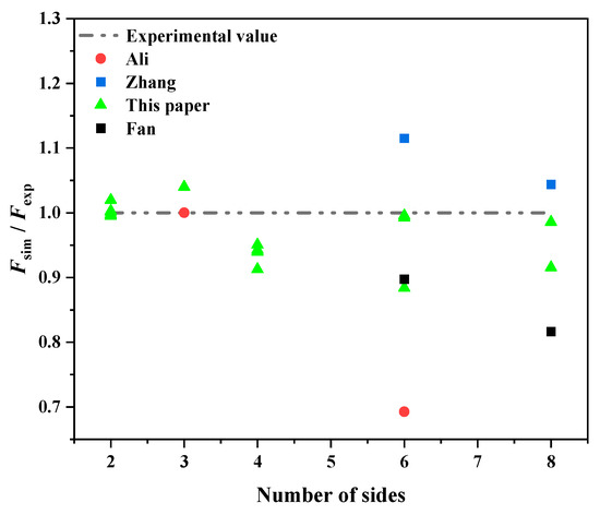 The ratio of the initial peak crushing force between the simulated value and the experimental value under different numbers of sides.