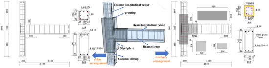 The prototype is derived from a typical multi-layer frame structure with a height of 3 m and a span of 5 m. Two RC frame joint specimens with a scale of 1:3 were produced, including one unreinforced specimen A-C and one reinforced specimen A-R-C. The concrete beams and columns are made of C40 concrete, with a column height of 830 mm and a column cross-section size of 200 × 200 mm2. HRB400 rebar with a diameter of 10 mm is used for the bearing longitudinal reinforcement, HRB400 rebar with a diameter of 6 mm is used for the stirrup. The space between the stirrups is 50 mm, and the space between the stirrups in the unsealed area in the middle of the column is 100 mm. The steel plate adopts Q335B steel plate and the welding rod adopts E50. The strength of grout is not less than C50. The reinforcement ratio is 1.57% (8C10), the stirrup ratios are 1.508/0.754% and 1.14/0.57% (C6@50/100), the beam length is 1330 mm, the cross-section size of the beam is 150 × 300 mm2, and the reinforcement ratio of the lower part is 0.935% (3C10). The stirrup ratio is 1.492/0.746% (A6@50/100). The specific parameters and reinforcement structure are shown in Figure 1.