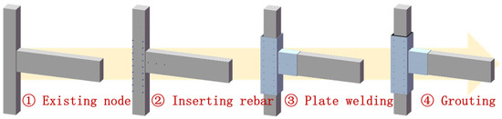 Joints are one of the important structural components of reinforced concrete frame structures, which play the role of internal force transfer between beam and column members. Brittle shear failure of joints will make the force transfer mechanism of the original frame structure system fail and will lead to serious damage or collapse of the structure in strong earthquakes. Many seismic disasters show that a large number of existing frame structures in China still have hidden dangers of insufficient shear-bearing capacity in the core area of beam-column joints, which seriously affects the safety performance of structures [1,2,3,4,5]. Therefore, it is necessary to improve the shear capacity of the beam-column joints in existing buildings by appropriate seismic strengthening methods, so as to prevent buildings whose seismic performance does not meet requirements from collapsing in strong earthquakes.