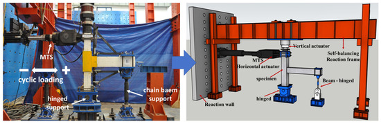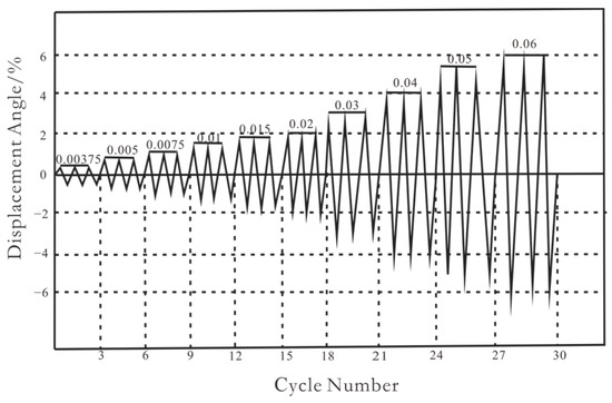 Considering the p-Δ effect, which cannot be ignored under large axial pressure, the joint is loaded at the column end. The axial load is applied by the reaction beam and hydraulic jack, and the horizontal repeated thrust is applied by the electro-hydraulic servo actuator (MTS). The test loading device is shown in Figure 3. In this test, the method of low-cycle loading is used to measure the seismic performance of the reinforced joint. At the initial stage of loading, the column top axial load is first applied to the predetermined axial pressure ratio by the hydraulic jack to ensure the free extension of the beam end in the vertical deformation process and to ensure that the joint does not produce initial internal force. Then, the electro-hydraulic servo actuator applies low cyclic horizontal load to the column top. The horizontal cyclic load is controlled by displacement, marked by the cracking of the specimen. According to American ANSI/AISC341-10 regulations [22], horizontal loading adopts an interlayer displacement angle control loading scheme, and the loading system is shown in Figure 4. Each stage is cycled three times to observe the loading process and test the phenomenon of the specimen in detail. When the bearing capacity of the specimen decreases to 85% of the maximum bearing capacity or when the loading reaches 1/35 of the displacement angle, the test is stopped.