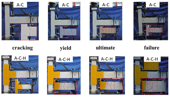 Upon the application of the secondary displacement load (with a displacement rate of 0.35%), a through crack appears at the A-C joint beam end, with a small crack width. At this point, the A-R-H joint begins to show only minor cracks. As the load increased further, the width and number of cracks increased on the beams of each joint. When the sixth level of loading (with 1% drift) was reached, a large crack began to appear at the beam end of the A-C joint, and the number of major cracks in the A-R-H joints also increased significantly. In the late loading period, the number of diagonal cracks in the two joints continued to increase as the loading continued.