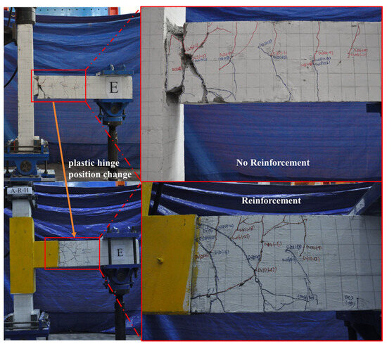 It can be seen from the experiments that the use of steel plates increased the bearing capacity of the joints. From the beginning to the end of loading, the failure process of the two joints was basically the same, going through the elastic deformation stage, crack formation stage, yielding stage, and final failure stage. For the specimen of A-C, the damage was mainly concentrated at the beam-column interconnecting piece, with a maximum crack width of 2 mm and concrete spalling. In contrast, the damage in specimens A-R-H was located far from the beam-column junction. Figure 6 illustrates that the concrete damage near the bottom of the beam was primarily focused in close proximity to the steel sleeve. This suggests that the presence of a steel sleeve at the connection point between the beam and column effectively restricts the development of a plastic hinge at the end of the beam. Overall, both joints exhibited the “beam hinge mechanism” damage pattern expected by the design.
