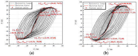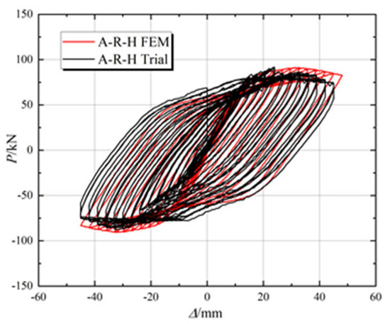 As shown in Figure 7, the hysteresis curves of the two joints showed a similar overall trend, with both joints passing through the elastic, yield, ultimate, and failure stages. In the elastic phase, the hysteresis curves of the two specimens are close to a straight line and change linearly. When the specimen entered the yield stage, the area of the hysteresis loop gradually increased, and the hysteresis loop of A-R-H was fuller than that of A-C, indicating that the hysteresis response of the A-R-H joints was better than that of the A-C joints. In addition, the ultimate load capacity of the A-R-H joint exceeds that of the A-C joint, indicating that it has a stronger hysteresis dissipation capability.