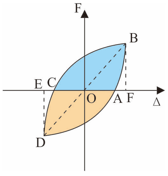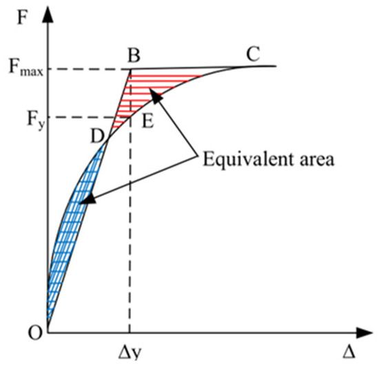 Ductility is an important index to measure the deformation capacity of a structure, and a key parameter to evaluate the seismic performance of a structure under low circumferential repeated loads. The ductility coefficient (μ) is generally used to express the ratio of ultimate displacement (Du) to yield displacement (Dy). Various methods, such as the farthest point method, geometric drawing method, and equal energy method [23], can be employed to determine the yield displacement. In this study, the isoenergetic method illustrated in Figure 11 was utilized for determining the yield displacement. Table 1 presents the results of the displacement ductility coefficients for the two joints. Table 1 clearly shows that the deformation capacity of A-R-H is better than that of A-C. The ultimate displacement of A-R-H is about 42 mm, while that of A-C is 48 mm. Additionally, the A-R-H joint exhibits higher forward and reverse displacement ductility coefficients compared to A-C. These findings suggest that the steel sleeve plays a positive role in improving the overall ductility performance of the joint.