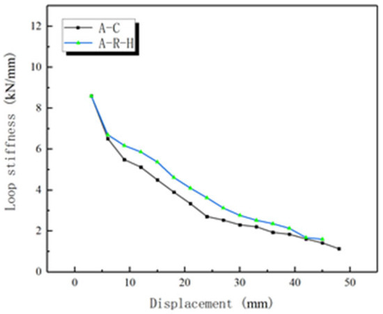 Within the figure, the trends of the two joints are basically the same. Initially, the initial stiffnesses of specimens A-C and A-R-H are comparable, which is due to the fact that both of them are in the state of elastic deformation during the initial loading stage. Both A-C and A-R-H experienced rapid stiffness degradation over the loading displacement range of 6 mm (drift rate of 0.35%) to 30 mm (drift rate of 1.8%). The rate of stiffness decay slows down after entering the yielding stage. From Figure 10, it can be seen that the stiffness of A-R-H is always higher than that of A-C, both in the initial stiffness and in the subsequent loading stages, which suggests that the provision of steel plates at the beam-column joints can help to enhance the stiffness of the joints.