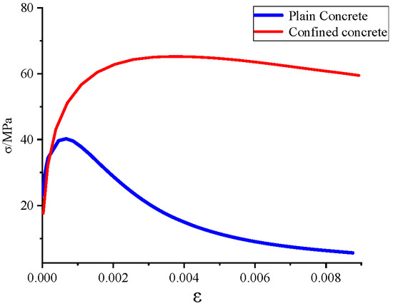 The ABAQUS software offers three constitutive models of concrete materials: the Concrete Smeared cracking model, the Concrete Brittle cracking model, and the Concrete Damage Plasticity (CDP) model. This investigation selects the CDP model as the concrete model for simulation, which accounts for the damage accumulation during the loading process of concrete and is suitable for the simulation of monotonic, cyclic, and dynamic loads under low confining pressures. Considering the stress state of the concrete in the steel-encased region, the reinforced area concrete’s constitutive model utilizes the uniaxial compressive stress–strain relationship curve suggested by Mander et al. [25]. The Mander model is formulated to address the effective lateral confinement effect of reinforcement on concrete, which is particularly applicable to the enhanced constraint zone in columns. The uniaxial compressive constitutive relationships for concrete under different constraint conditions used in this investigation are displayed in the Figure 13.