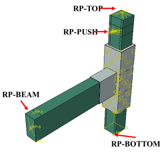 An embedded approach is required to simulate the bond-slip relationship between reinforcement and concrete. Interfaces between old and new concrete, as well as between the steel plate and concrete, were modeled using surface-to-surface contact with normal hard contact and tangential Coulomb friction. The friction coefficient for the interface between old and new concrete was set to 0.8, while the friction coefficient for the interface between the steel plate and concrete was set to 0.6 [27]. Under the premise of ensuring accuracy, after several grid divisions, the seed density of the concrete parts is finally selected to 50, that is, the size of the grid is 50 mm × 50 mm × 50 mm. The grid size of the reinforced steel plate and structural adhesive is 50 mm × 50 mm × 50 mm, and the steel bar adopts the truss unit and the grid is divided into 50 mm. The grid of each component is shown in Figure 15 below. The model underwent structured mesh generation, with a seed density of 20 applied to the concrete components, and the meshing illustration for each component is shown in the following Figure 15. The model has four reference points (RPS), as shown in Figure 16. Among them, RP-Top and RP-PUSH are the coupling points of the column top and column end, respectively, which are used to apply axial pressure and lateral displacement. RP-BOTTOM and RP-BRAM are the coupling points of the column bottom and beam end, respectively, and 6 degrees of freedom constraints are applied to them. The lateral displacement is applied at the coupling point RP-PUSH at the end of the column, and the cyclic loading regime is the same as that of the test.