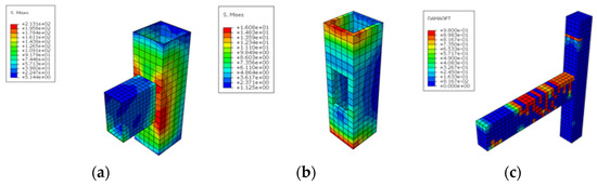 In this study, the finite element model of the A-R-H joint is established using ABAQUS software (version 2016). Among them, the original concrete columns, steel plates, and grout use solid units—three-dimensional eight-node reduced integral solid elements (C3D8R). The steel bars were simulated using truss elements, two-dimensional three-node (T3D2).
