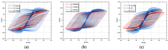 Hysteresis curve of finite element joint: (a) thickness of steel plate; (b) strength of grout material; (c) reinforcement range.