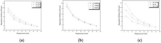 Stiffness is a measure of a structure’s ability to withstand elastic deformation when subjected to external forces in structural engineering. When the specimen is repeatedly loaded at low circumferences, its stiffness decreases. This means that as the displacement amplitude increases, less load is needed to achieve the same displacement value. The decrease in stiffness can be used to indicate the cumulative level of damage to the structure under repeated loads. In this study, the stiffness of the specimen is expressed as positive stiffness Ki, and its calculation formula is shown in Equation (2) [23]. The stiffness degradation curves are shown in Figure 10.