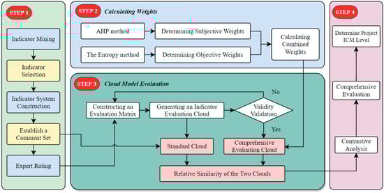 Evaluating intelligent construction management (ICM) levels involves multiple complex dimensions, including technology application, process management, integration capability, and organizational capability, each with various layers of indicators. The data associated with these factors are often characterized by significant fuzziness and uncertainty. Traditional single-method approaches typically have limitations when dealing with such complexities. The AHP excels in handling complex decision-making problems by decomposing them into a hierarchy and using expert judgment, making it suitable for qualitative evaluation. However, the AHP is highly subjective, with weight determination often influenced by expert preferences, lacking full utilization of objective data information. The entropy weight method (EWM), as an objective weighting technique, reflects the differentiation among indicators through the information entropy of the data, thereby determining weights more objectively. However, EWM relies solely on the data, ignoring expert experience and judgment, which may result in the underestimation of the importance of some critical indicators. The cloud model can handle fuzziness and uncertainty in the evaluation process, making it particularly suitable for complex problems that combine qualitative and quantitative aspects. However, when used alone for evaluation, the cloud model lacks the integration of subjective judgment and objective analysis in determining indicator weights, which may affect the comprehensiveness of the evaluation results. To overcome the limitations of single methods in evaluating ICM levels, this study integrates AHP, EWM, and the cloud model, constructing a comprehensive evaluation model that leverages both subjective and objective strengths. The integrated application of these methods can better address the complexity and uncertainty in the comprehensive evaluation of prefabricated ICM levels, scientifically reflect the interrelationships between indicators, and effectively handle fuzzy and uncertain information, thereby overcoming the limitations of traditional methods. This provides a more reliable and comprehensive evaluation tool for prefabricated project management. Based on this, we developed the following evaluation process, as illustrated in