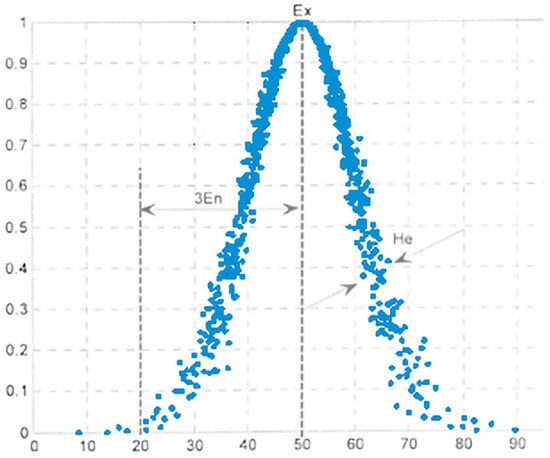 (entropy) measures the degree of uncertainty and represents the fuzziness and randomness of the qualitative concept. It indicates the dispersion of quantitative data and reflects the range of cloud droplets that can be accepted by the qualitative concept within the domain space, corresponding to the “span” of the cloud on the map. The larger the entropy, the greater the fuzziness and randomness of the qualitative concept, and thus the larger the “span” of the cloud.