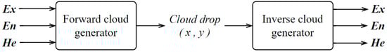 The cloud model can convert qualitative concepts and quantitative values through a cloud generator, either forward or backward. The forward cloud generator refers to the conversion from qualitative to quantitative, where the cloud generator outputs the cloud droplets and the cloud map composed of these droplets based on the three digital characteristics of the cloud model and the number of cloud droplets. The backward cloud generator refers to the conversion from quantitative to qualitative, where it inputs precise values
