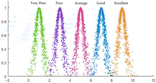 We can input the rating cloud model numerical characteristics into the forward cloud generator. Using MATLAB software tools, we can obtain the standard cloud maps for each evaluation level, as shown in