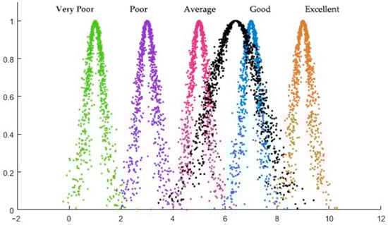 The overall expected value is calculated as 6.4071 using Equation (18), reflecting the overall ICM level of the case project. The comprehensive entropy, calculated as 0.9580 using Equation (19), indicates the degree of dispersion of all indicators after entropy weighting. The comprehensive hyper-entropy is calculated as 0.1739 using Equation (20), which shows the overall uncertainty. Therefore, the comprehensive evaluation cloud for this project is C(6.4071, 0.9580, 0.1739). This evaluation cloud, along with the digital characteristics of the comment set cloud model, is input into a forward cloud generator. Using MATLAB code, the evaluation cloud diagram is plotted and compared with the standard cloud. The black cloud droplets represent the cloud diagram of the case project, while the colored cloud droplets represent the standard clouds for each score. The results are shown in