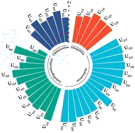 The comparative analysis of the expected values for each indicator in the chart shows that, within the intelligent integration capability (), the average expectation for data integration () is lower than that for system integration (). Among the third-level indicators, the multi-stakeholder data integration degree () scores higher, whereas the scores for the multi-type data integration degree () and process perception data integration degree () are relatively lower.