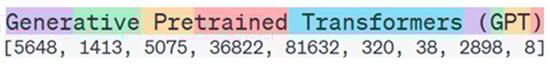 Tokenization is the process aimed at creating a digital representation of a real-world object. In the context of LLMs, text is divided into tokens, which can be words, sub-words, or individual characters. These tokens are mapped to specific codes (numerical identifiers) [], as illustrated in Figure 3. The same principle can also be applied to images, where images are similarly tokenized to facilitate processing by AI models [].