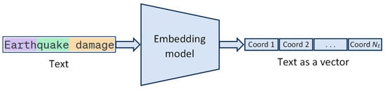 Each token is converted into a numerical vector known as an embedding, of a specific dimension (dimension ), as depicted in Figure 4. This vector aims to represent the meaning of the word (or token) in a multidimensional vector space, capturing both semantic and syntactic relationships with other tokens []. Accordingly, the model has a predefined vocabulary of tokens with a certain size (), and an embedding matrix is created with dimensions equal to (each column represents the vector representation of a token from the vocabulary in the embedding space) [].
