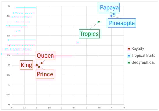 The distance between two vectors measures their relatedness [,]. Small distances indicate high relatedness, while large distances suggest low relatedness. To better understand this concept, consider the embeddings represented in the two-dimensional space shown in Figure 5. The “Royalty” cluster consists of the words King, Queen, and Prince, which are located close to each other because they are semantically related, representing terms associated with monarchy and nobility. Their coordinates reflect their strong semantic connections, forming a tight cluster in the vector space. The “Tropical Fruits” cluster is composed of the words Pineapple and Papaya, which are located in another region of the space, reflecting their semantic relationship as tropical fruits. This cluster is distant from the Royalty cluster, highlighting the distinct context and meaning of these words. The “Geographical” cluster contains only the word Tropics, which is associated with geographical and environmental concepts, particularly relating to regions where fruits like pineapples and papayas grow. Therefore, it is placed closer to the Tropical Fruits cluster than to the Royalty cluster but still distinct to indicate its unique context.