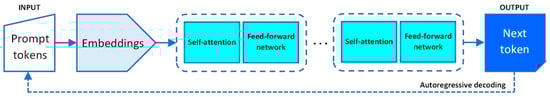 The process of predicting the next token involves several steps. The context vector, derived from the attention mechanism, is processed through additional layers of the NN, such as feed-forward neural network layers. The resulting state then passes through an output layer, typically a linear transformation followed by a softmax function. This generates a probability distribution over all tokens in the model’s vocabulary. The token with the highest probability is generally selected as the next in the sequence, though techniques like sampling can be employed to introduce diversity. This process occurs iteratively, with each new predicted token being added to the context for the next prediction [,,] (Figure 6).