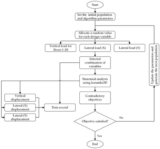 We employed a multi-objective genetic algorithm (MOGA) with a parametric model of high-rise buildings to create a robust ML model for predicting structural responses under various conditions. This approach ensured a diverse set of solutions that reflect potential real-world scenarios. Variables such as floor loads and lateral forces from wind and seismic activity were included in the dataset. A total of 7347 distinct solutions were generated, providing a comprehensive dataset for training the ML model. The variables and their respective domains are detailed in Table 3.