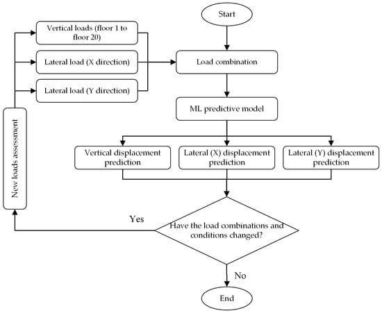 In addition to serving as a dataset generator for the ML model, the framework developed in this research functions as a digital twin of the high-rise building. This digital twin can simulate various loading scenarios to evaluate the building’s performance under different conditions. In real-world applications, sensors can monitor actual loads on the structure, enabling continuous SHM and real-time evaluations. Figure 2 presents a flowchart of the developed definitions in Grasshopper and Karamba3D for structural modeling, FEA simulations, and data generation. Figure 3 presents a flowchart of the proposed framework to predict structure displacements in the vertical, lateral X, and lateral Y directions.