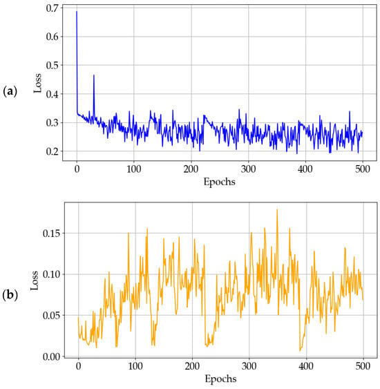 Loss charts of the developed ML model over 500 epochs: (a) training; and (b) validation.