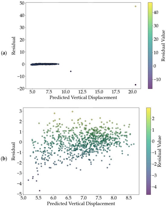 Apart from the two cases, the residual values during the training phase for predicting vertical displacement show very high accuracy. During the training phase, the values are predominantly concentrated near 0. In the testing phase, there is also a suitable density within the range of −2 to 2, and the results indicate the model’s good performance in predicting vertical displacement. The residual plots for training and testing for vertical displacement are shown in Figure 5.