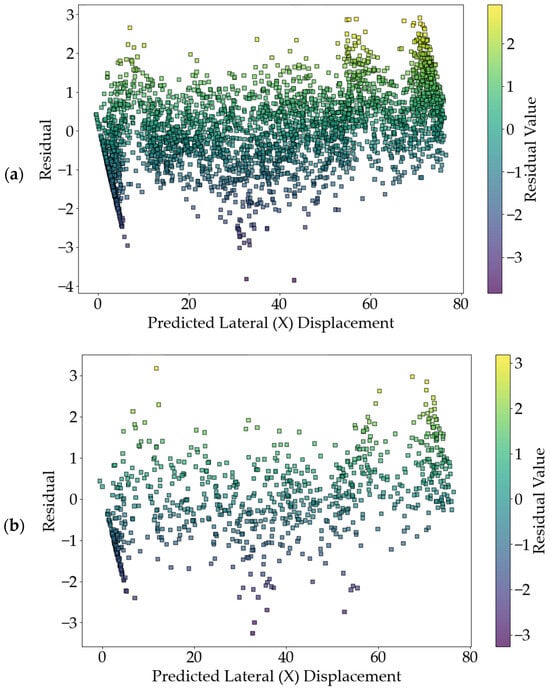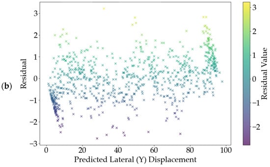 Residual values plotted for (a) training; and (b) test data for lateral (X) displacement.