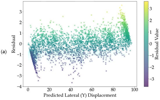 The residual values for training the model to predict displacement in the Y direction indicate a suitable density within the range of −2 to 2, especially in the range of −1 to 1. Other values are within a maximum range of −4 to 3. The testing plot for predicting displacement in the Y direction shows a uniform density between −2 and 2, which exhibits slightly more dispersion compared to the predictions made for the X direction; however, it still demonstrates acceptable performance. The residual plots related to training and testing for predicting displacement in the Y direction are shown in Figure 7.
