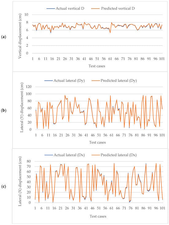 The actual and predicted (a) vertical; (b) lateral (X); and (c) lateral (Y) displacement values.
