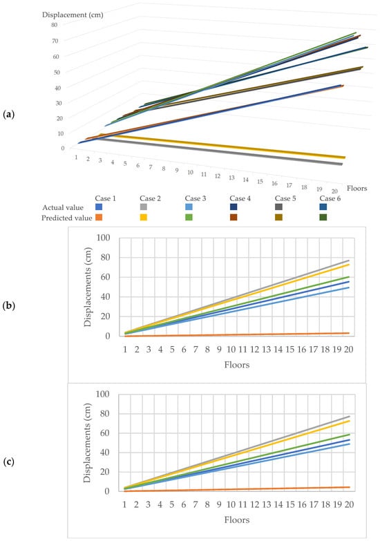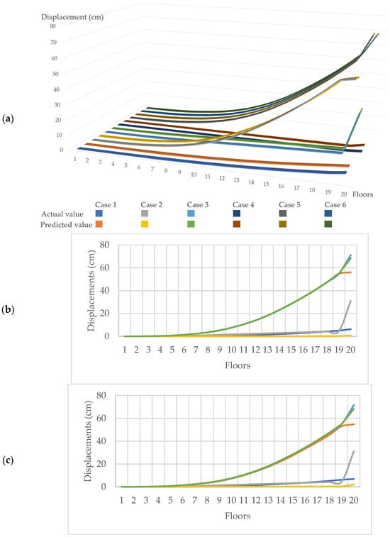 Actual vs. predicted displacement values over the entire structure height in each floor in X direction for six test cases: (a) actual vs. predicted values; (b) actual values; and (c) predicted values. Each colored line in the figures represents a test case.