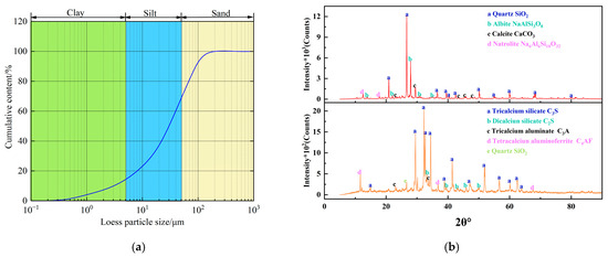 Particle size distribution (a) and XRD results of loess and cement (b) [24].