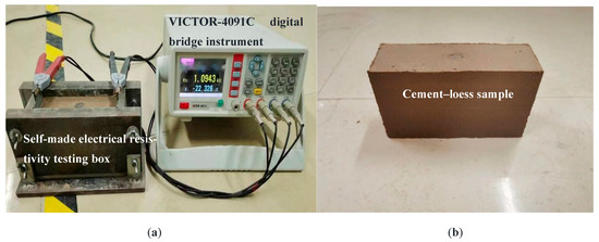 This study adopted the two-electrode method to measure the cement–loess electrical resistivity. According to standard ASTM [27], we designed and constructed an electrical resistivity testing box which was rectangular with an internal size of 12 cm × 4 cm × 7 cm. The inner layer was made of high-strength plexiglass, the outer layer was made of a 1 cm thick steel plate, and the electrodes in contact with the soil sample were made of stainless steel. The resistivity test instrument adopted a (VICTOR-4090A, Shenzhen, China) digital bridge with a maximum frequency of 100 kHz, 0.0001 Ω–99.99 MΩ resistance range, and maximum basic accuracy of 0.1%. The instrument can automatically identify and choose the appropriate test range according to the measured cement-loess. The digital bridge was clamped at both ends of the electrode through a crocodile clip, as shown in Figure 2, which was used to measure the electrical resistance directly. Then, the electrical resistivity could be further calculated based on the electrical resistance and the geometry of the cement–loess sample.