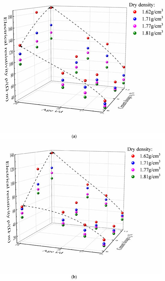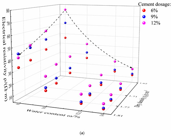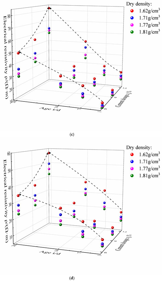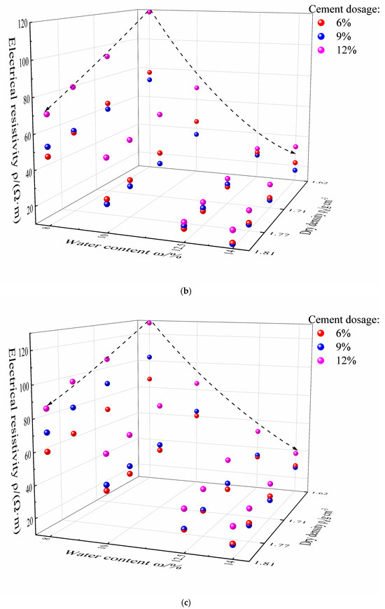 From Figure 3, it can be seen that the influence of water content on resistivity is significant when the water content is lower than the optimal value, and then, the influence of the water content decreases. Under the same dry density condition, the low-water-content sample has relatively scarce free water in its pores, and the air phase volume proportion in the internal pores is relatively high. Thus, the connecting channels that are formed by the pore water in the cement–loess are limited. These factors result in poor connectivity between pore water and loess particles, and the loess particles are loosely arranged with a smaller contact surface area, leading to a higher electrical resistivity. As the water content increases, the conductive path abilities become more obvious, and the electrical resistivity shows a significant downward trend [29]. When the water content is higher than the optimal value, a large number of double-layer conductive structures can be formed, and the water film can produce a wedging effect between loess particles. As a result, the electrical resistivity of cement–loess is significantly reduced by the soluble salts in the loess that dissolve in the pore water along with the replacement of the air phase by the liquid phase. However, the decreasing level of resistivity slows down and tapers off.