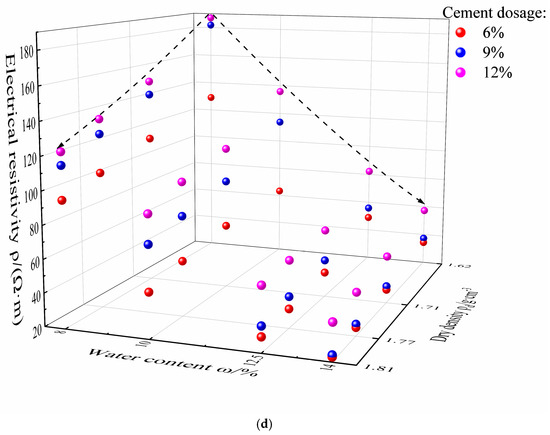 - A modified Archie resistivity formula was used to establish a power-law regression model, which considers ρd·w and aw·T independently. Further, a three-dimensional fitting model was established using water content, dry density, curing age and cement dosage as comprehensive influencing factors. Finally, the prediction accuracy of the electrical resistivity model was 0.94 R2. Therefore, the electrical resistivity could quantitatively express the influencing factors, which proved that the electrical resistivity is very important.
