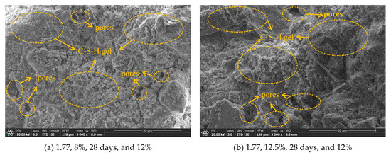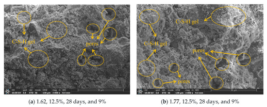 As shown in Figure 5, the microstructure of the cement–loess was evaluated under various conditions (ρd = 1.62 and 1.77 g/cm3; ω = 12.5%; t = 28 days; aω = 9%). It can be observed that there are obvious differences in the pore distribution under the various dry densities, with small pores distributed densely in the cement–loess with a higher dry density. Specifically, the percentage of pore volume with 1.62 g/cm3 is much higher than that of 1.77 g/cm3 [31,32]. When the dry density decreases and the pore volume increases, there is reduced particle contact between cement–loess. This blocks the contact and connectivity between the soil particles, and the corresponding cement–loess has a higher resistivity. In addition, it can be seen that dense point-like hydration products form on the surface of the soil particles, filling the pores and further bonding the particles. Moreover, larger agglomerated structures of the particles and cement hydration products can be observed, which hinder the propagation of current, slowing down the decrease in electrical resistivity caused by the change in dry density.