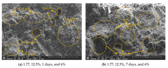 - Different water contents (8 and 12.5%) and cement dosages (6, 9, and 12%) were selected for microscopic mechanism analysis at curing ages of 1, 7, and 28 days. After the measurement of electrical resistivity, the samples were terminated in their hydration reaction by low-temperature drying and sealed in a plastic bag for preservation [28].